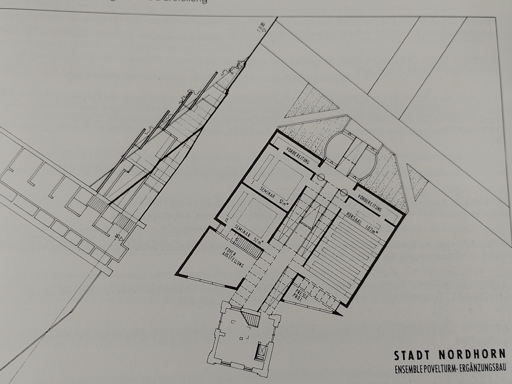Hierzu erhielt ich von der Stadt Nordhorn den Auftrag, auf dem Povelgelände - unter Einbeziehung des alten Povel-Turms - einen Ergänzungsbau mit Seminar-, Ausstellungs- und Laborräumen zu planen.